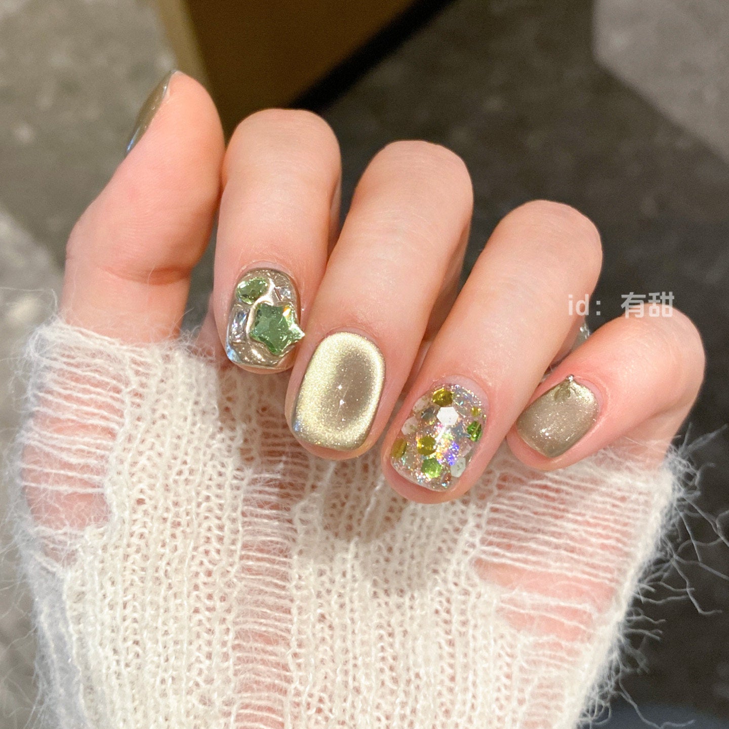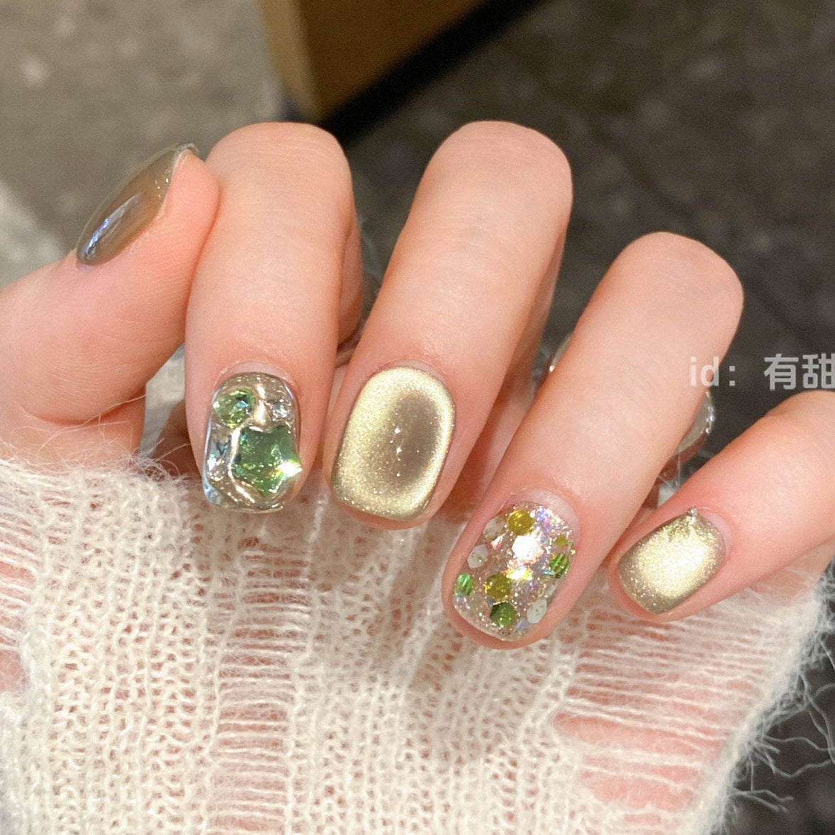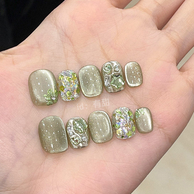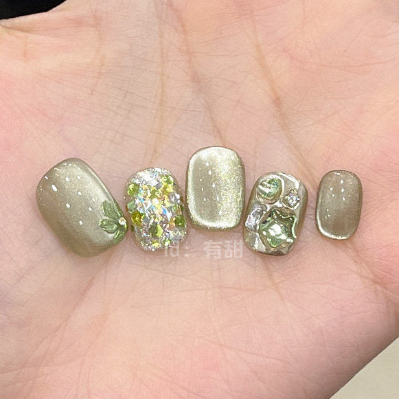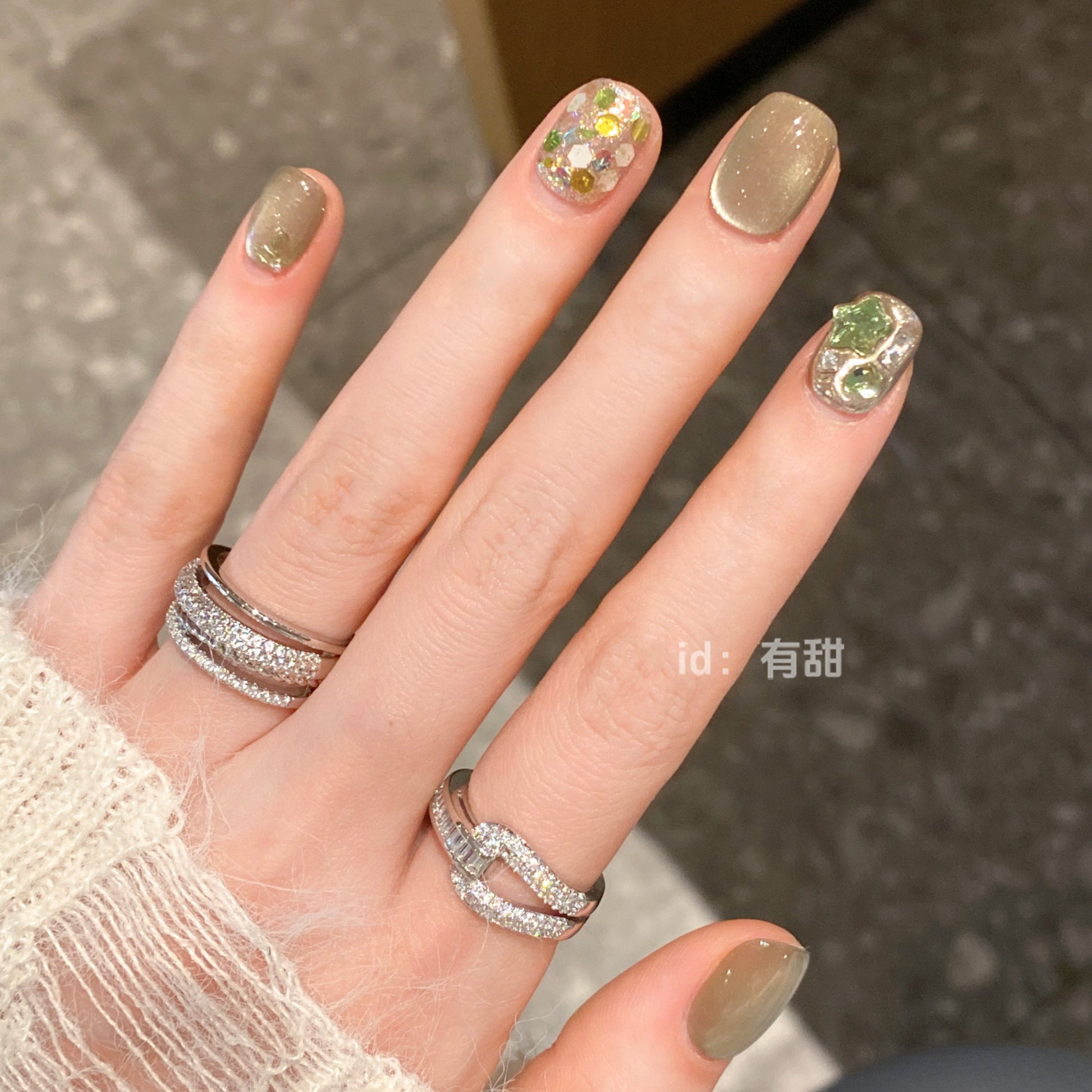 落ち着きのあるオリーブグレージュをベースに、繊細なラメと立体感のあるニュアンスアートを重ねた、モード感と上品さを兼ね備えたネイルチップ。