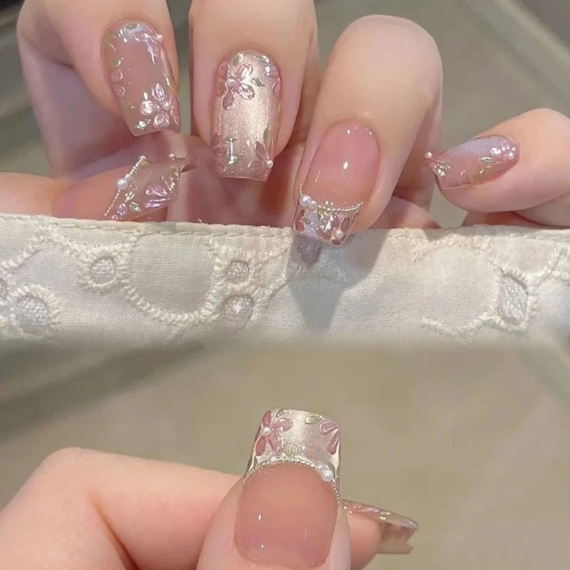 やわらかなシアーピンクをベースに、透明感のあるフラワーモチーフと繊細なクリスタルパーツをあしらった、儚く上品な印象のネイルチップ。