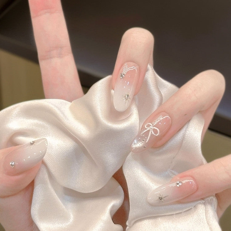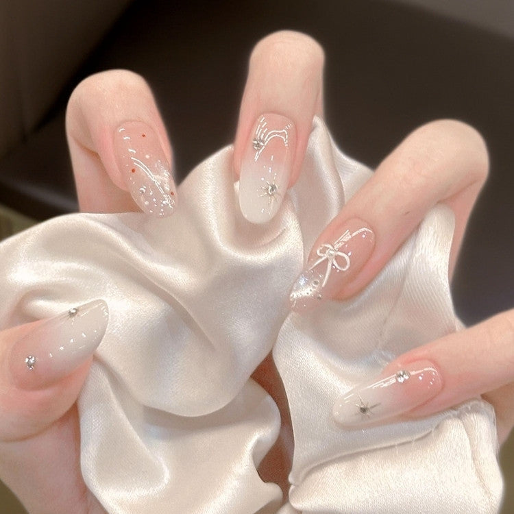 やわらかなシアーミルクカラーをベースに、繊細なシルバーニュアンスとリボンモチーフをあしらった、透明感あふれる上品なネイルチップ。