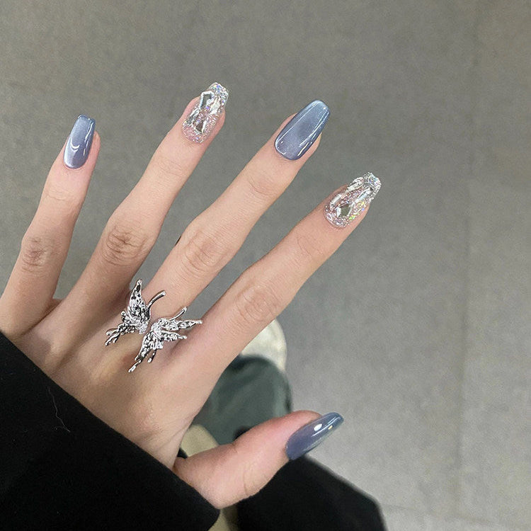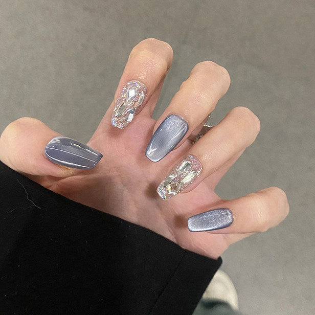 落ち着いたスモーキーブルーを基調に、存在感のあるシルバークラッシュアートを組み合わせた、クールで洗練された印象のネイルチップ。